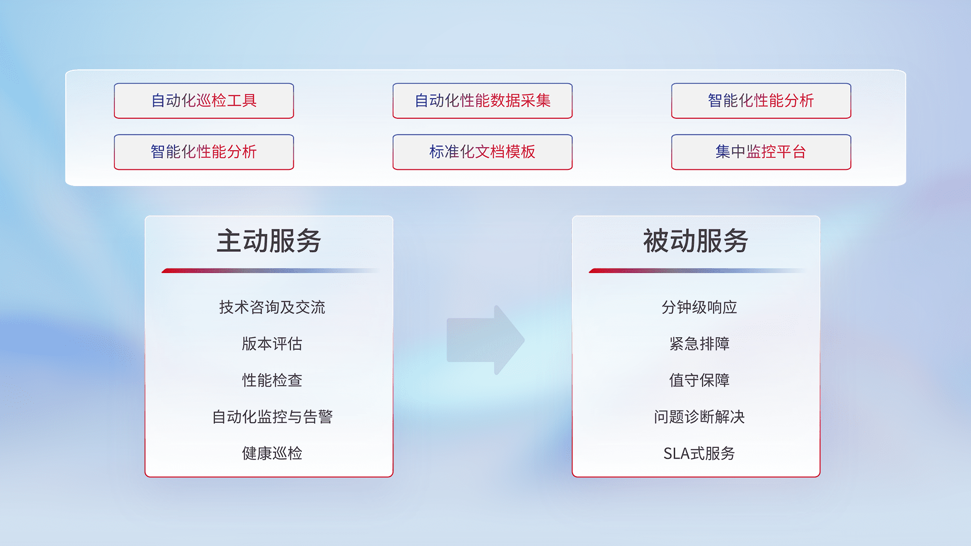智能化工具和标准化文档,,,,保障服务质量,,,,提供主动服务(包含技术咨询、、版本评估、、、性能检查、、、自动化监控与告警、、、、健康巡检)和被动服务包含(分钟级响应、、、、紧急排障、、、、值守保障、、问题诊断解决、、、、SLA服务)。。。
